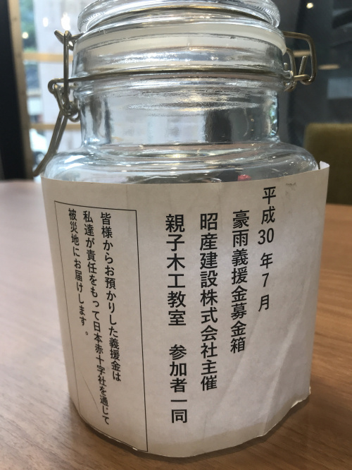 「平成30年7月豪雨災害義援金」にご協力頂きました第11回 大工さんと作ろう!親子木工教室の参加者の皆様本当にありがとうございました。皆様にご協力頂き集まった義援金の合計は\14,086-でした。